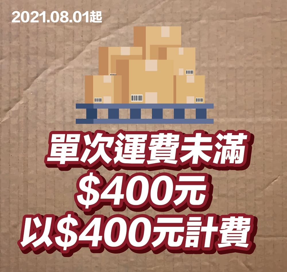 2021.08.01起,單次運費未滿$400元,以$400元計費。